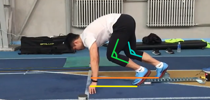 ▲黄色线为前起跑器距离,橙色线为后起跑器距离,绿色角为预备时前置腿膝关节角度,蓝色角为后置腿膝关节角度(图片来源:果壳)